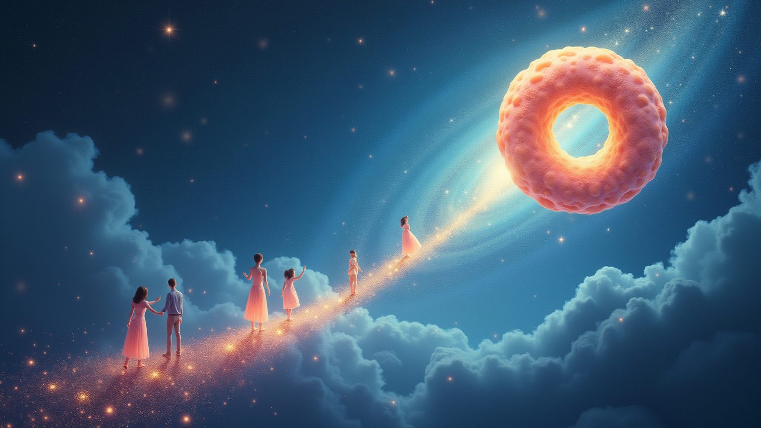 - Ein einzelner Donut schwebt friedlich am Himmel: Repräsentiert innere Ruhe und das Gefühl, im Einklang mit sich selbst zu sein, trotz ungewöhnlicher Umstände.